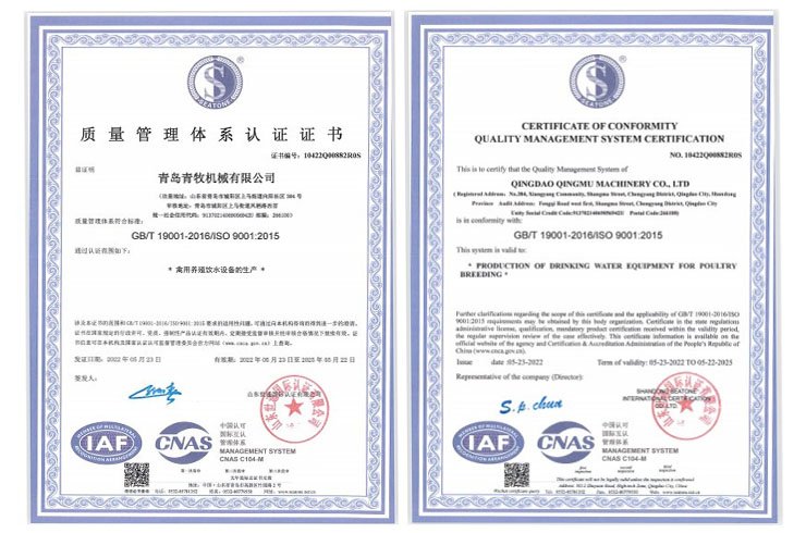青島青牧機械有限公司成立于2013年,是一家集研發(fā)、生產(chǎn)、銷售、服務(wù)于一體的綜合性企業(yè)。公司專注于家禽飲水設(shè)備的研發(fā)和生產(chǎn),擁有專業(yè)的研發(fā)團隊、先進的加工設(shè)備以及自動化組裝線,力求打造“簡單、高效、環(huán)保”的高端禽用飲水系統(tǒng)。